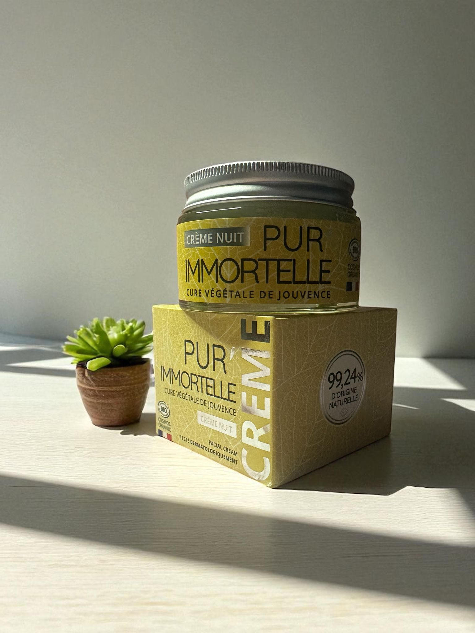🌙 Crema Notte Pur Immortelle – Rigenerante Naturale. Con il 99,24% di ingredienti naturali nutre e rigenera la pelle durante il sonno, donando elasticità e luminosità. Contrasta i segni del tempo per un risveglio radioso.